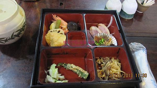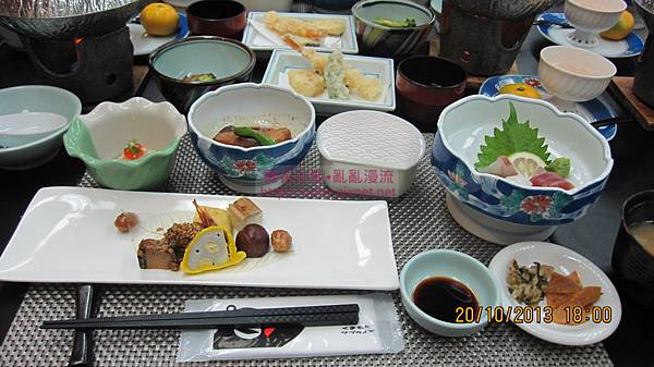 這天在溫泉旅館吃晚餐,擺了一大桌的盤子,看起來很豐盛,事實上內容物蠻一般的;我最喜歡那盤大概算前菜的東西,栗子好甜,旁邊有一小顆看起來像種子的東西,咬下去不知道是什麼果實,也好吃。