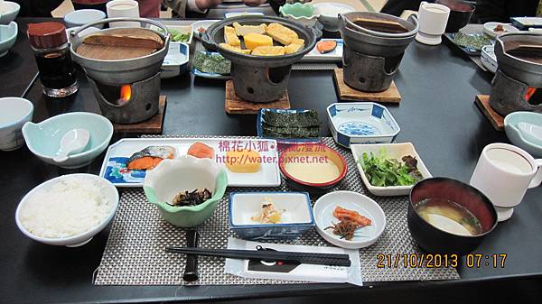 溫泉旅館的純日式早餐,大部分不是醃的就是生的,談不上多美味,但也還可以~